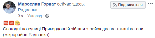 "Сегодня по улице Пограничной сошли с рельсов два грузовых вагона (микрорайон Радванка)", - написал он и выложил фото поезда в соцсеть.
