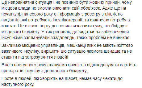 Супрун призвала местных управленцев в регионах, где есть проблемы с поставкой инсулина, "решить эту ситуацию как можно скорее". "Уже со следующего года планируем полностью возмещать стоимость препаратов инсулина из государственного бюджета", - резюмировала Супрун.