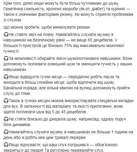 И.о. министра здравоохранения Ульяна Супрун заявила, что 30 минут прослушивания очень громкой музыки в наушниках могут нанести непоправимый вред слуху. Об этом он написала на своей странице в Facebook.