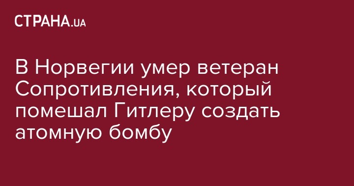 Вчера, 21 октября, в Норвегии, не дожив всего один год до столетнего юбилея, скончался Йоахим Реннеберг, известный участник антигитлеровского движения Сопротивления во время Второй мировой войны, который принимал участие в уничтожении завода, производившего тяжелую воду.