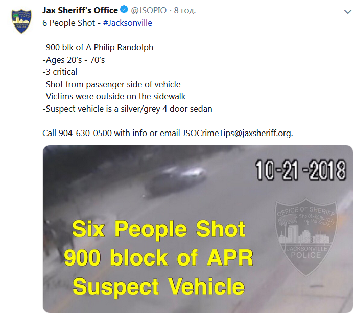 В США снова произошла стрельба на городских улицах. Здесь, 21 октября, в городе Джексонвиль (штат Флорида - Прим.Ред.) произошла перестрелка, в которой шесть человек получили ранения.