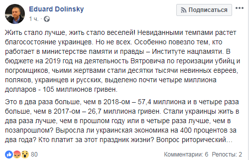 В проекте бюджета на 2019 год госфинансирование деятельности "министерства памяти и правды" – Института нацпамяти Вятровича, в отличие от медицины и образования, увеличено почти вдвое.