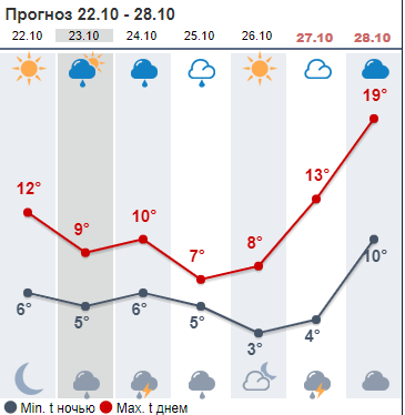 Ресурс Мeteoprog.ua дает похожий прогноз, но по данным этого ресурса самые холодные дни недели четверг и пятница, а среди недели будет идти дождь, но не обильный и без снега. На выходных +13...+19, пасмурно.