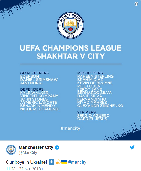 Заявка "горожан" обнародована в официальном Twitter команды. "Наши парни в Украине", - подписала заявку пресс-служба Манчестер Сити.