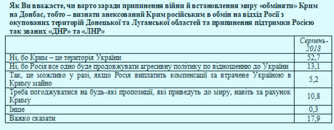 "Против такого варианта преимущественно настроены и на юге (56%) и востоке (41%), однако в этих регионах определенная часть жителей согласны с тем, что" надо соглашаться на любые предложения, которые приведут к миру, даже за счет Крыма "(23% на юге и 18% на востоке)", - отмечают социологи.