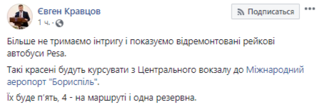"Больше не держим интригу и показываем отремонтированные рельсовые автобусы Pesa. Такие красавцы будут курсировать с Центрального вокзала в Международный аэропорт "Борисполь". Их будет пять, 4 - на маршруте и один резервный", - написал Кравцов.