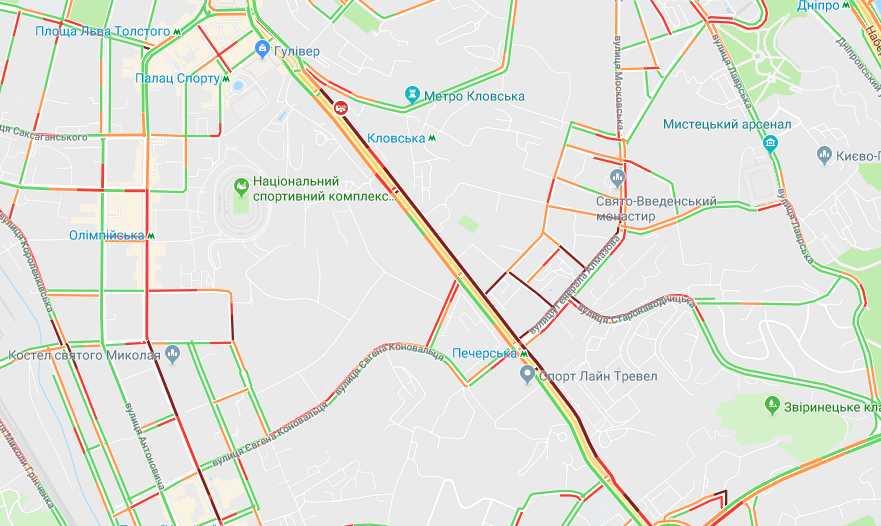 По состоянию на 12:00 проспект Леси Украинки заблокирован на спуске от генерала Алмазова до Киевской крепости. Объездной вариант по Большой Васильковской также практически весь стоит от бульвара Дружбы Народов до метро "Олимпийская".