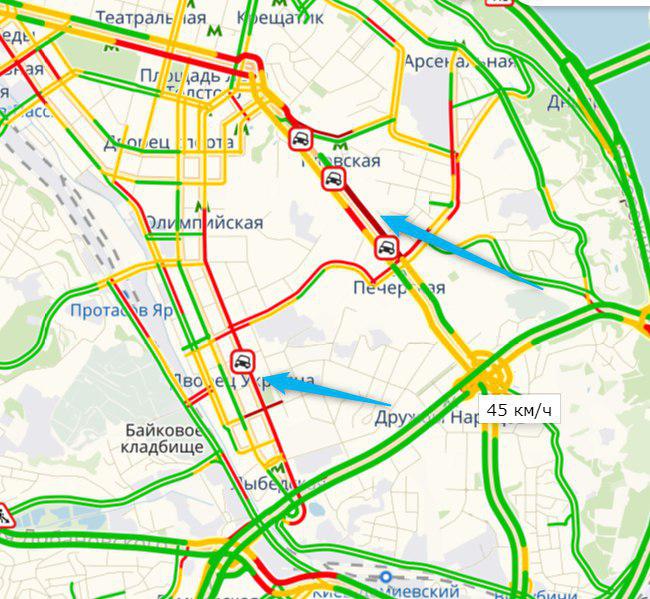 ДТП полностью заблокировало движение в сторону БЦ Парус от станции метро Печерской. Судя по Google Maps, хвост от затора растянулся даже за станцию метро. Также временно заблокировано движение троллейбусов маршрутов №14 и №15 по бульвару Леси Украинки в направлении железнодорожного вокзала.