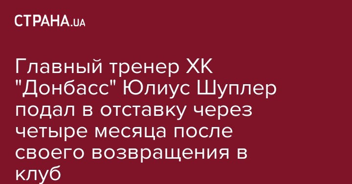 Главный тренер ХК "Донбасс" Юлиус Шуплер подал в отставку. 67-летний специалист из Словакии не сможет продолжить работу в донецком клубе по состоянию здоровья. Об этом сообщается на сайте клуба.