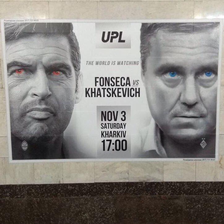 На постере тренер "горняков" Пауло Фонсека изображен с красными глазами, тогда как тренера "динамовцев" Александра Хацкевича напечатали с синими глазами.