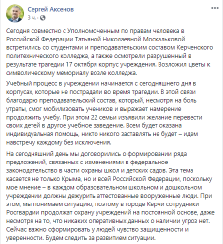 Двадцать две семьи попросили перевести их детей из Керченского политехнического колледжа, где произошло массовое убийство, в другие учебные заведения. Об этом на своей странице в Facebook сообщил "глава" Крыма Сергей Аксенов.