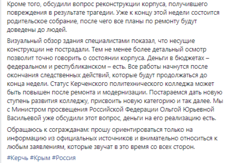 Напомним, 17 октября в Керчи студент политехнического колледжа устроил теракт. Он вооружился самодельным взрывным устройством и ружьем, устроил взрыв и стал расстреливать преподавателей и студентов учебного заведения, а потом покончил с собой.