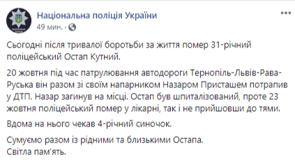 Как сообщалось, на автодороге "Тернополь-Львов-Рава-Русская" произошло ДТП, в результате которого при исполнении служебных обязанностей погиб 22-летний полицейский из Львова, а его напарника, 31-летнего лейтенанта полиции Кутного госпитализировали.