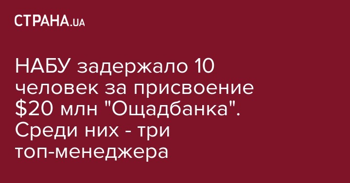 Вчера, 23 октября, детективы Национального антикоррупционного бюро Украины (НАБУ) задержали десять человек, которых подозревают в завладении 20 млн долларов государственного "Ощадбанка". Об этом сообщает пресс-служба НАБУ.