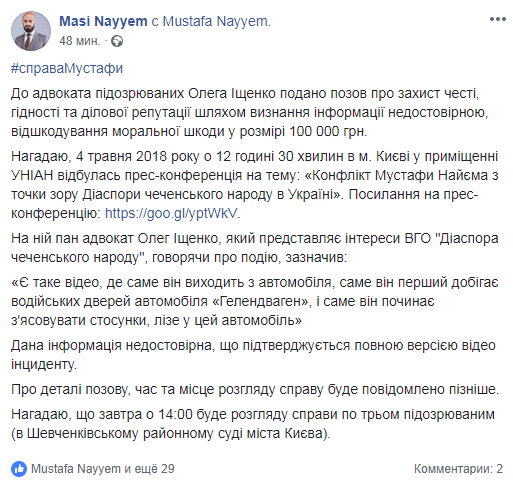 На адвоката подозреваемых по делу о нападении на народного депутата Мустафу Найма Олега Ищенко подан иск о защите чести, достоинства и деловой репутации. Об этом сообщил юрист и брат депутата Маси Найем на своей странице в Facebook.