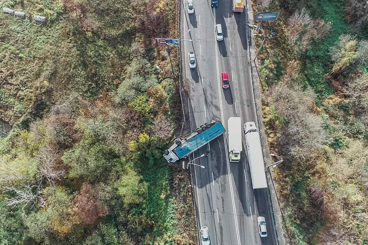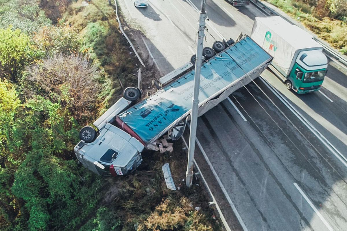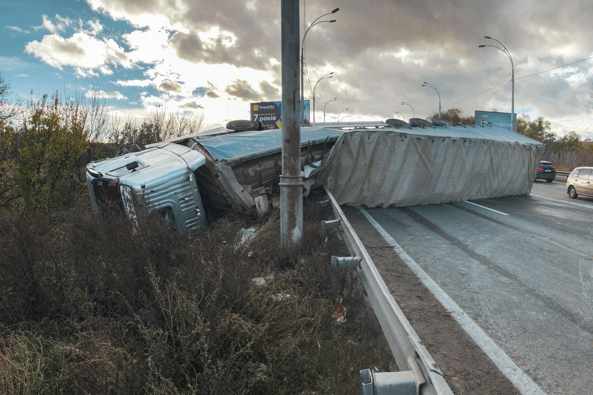 Авария случилась около 12:00. Фура ехала по улице академика Заболотного в сторону Столичного шоссе. Предварительно, дальнобойщик превысил безопасную скорость и не удержал груженный грузовик на дороге. Volvo перевернулась на правый бок, снесла отбойник и зависла на краю обрыва.