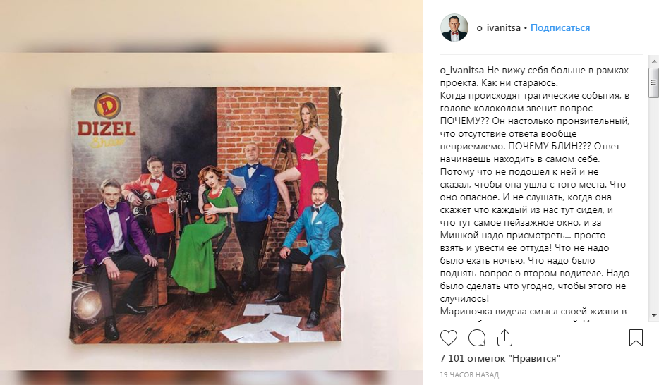 Актер "Дизель Шоу" Олег Иваница заявил об уходе из проекта из-за ДТП, в котором погибла его коллега Марина Поплавская. Об этом он написал на своей странице в Instagram.