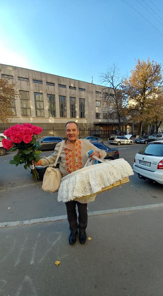 Мишель Терещенко пришел забирать сына из роддома с корзиной и в вышиванке. Фото