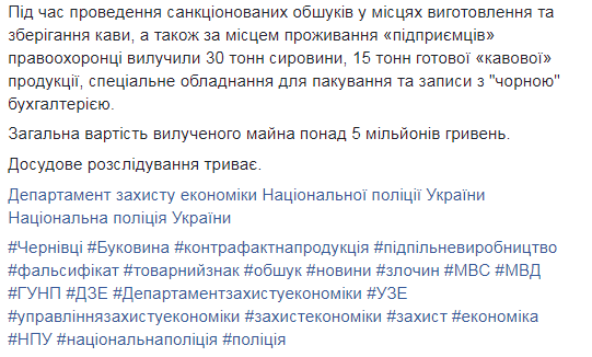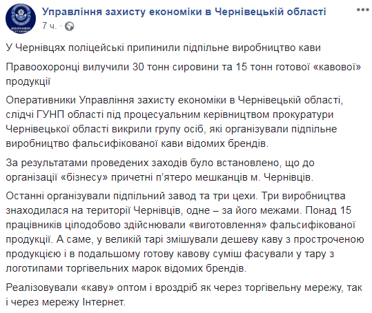 Оперативники Управления защиты экономики в Черновицкой области, следователи ГУНП области под процессуальным руководством прокуратуры Черновицкой области разоблачили группу лиц, организовавших подпольное производство фальсифицированного кофе известных брендов.