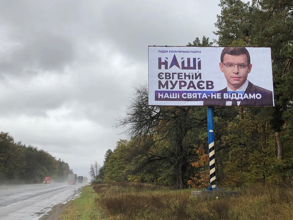 Лидер новосозданной партии "Наши" Евгений Мураев обновил свою рекламную линейку, разместив выполненные в одной стилистике борды, но с разными слоганами: "наши праздники - не отдадим", "наших детей не отдадим", "наши церкви не отдадим", "наши ценности не отдадим".