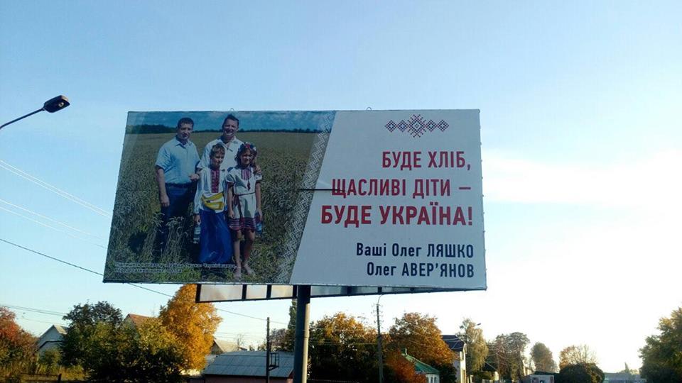 Олег Ляшко выпустил совместные баннеры с представителем Радикальной партии в Черниговской области Олегом Аверьяновым. "Будет хлеб, счастливые дети - будет Украина", - утверждает Ляшко, правда, не отмечает, что хлебобулочные изделия за год подорожали почти на 20%.