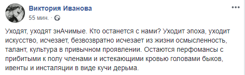 "Уходят, уходят знАчимые. Кто останется с нами? Уходит эпоха, уходит искусство, исчезает, безвозвратно исчезает из жизни осмысленность, талант, культура в привычном проявлении. Остаются перфомансы с прибитыми к полу членами и истекающими кровью головами быков, ивенты и инсталляции в виде кучи дерьма", – написала Виктория Иванова.