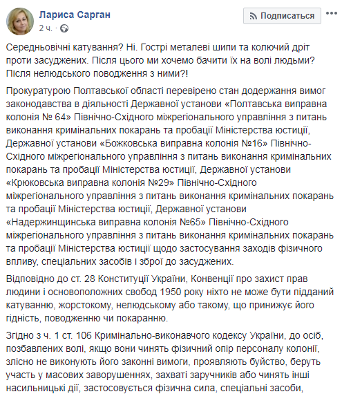 Сотрудники прокуратуры Полтавской области выявили нарушения в обращении с заключенными в местных тюрьмах. Об этом сообщила пресс-секретарь генпрокурора Лариса Сарган в Facebook.