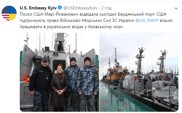 "Посол США Мари Йованович посетила сегодня Бердянский порт: США поддерживают право Военно-Морских Сил ВС Украины свободно работать в украинских водах в Азовском море", - говорится в сообщении, опубликованном в пятницу, 26 октября, на учетной странице посольства США в твиттере.