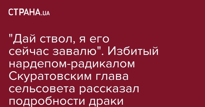 Сельский голова рассказывает, что вечером со своим товарищем возвращался домой. Ехали вдвоем по полевой дороге, на мосту они увидели знакомого лесника и вышли, чтобы с ним поздороваться. В это время из другой машины выскочил народный депутат и напал на двух мужчин с криками: "Это моя земля". "Я его спрашивал: за что ударил? А он: да я тебя сейчас вообще здесь зарою! Говорит пареньку, который стоял рядом, может, его охранник: дай ствол, я его сейчас завалю. В этот момент мне звонит жена, я говорю: Лена, если меня застрелят, то знай, что это Скуратовский Сергей Иванович", - рассказал Сорочан.