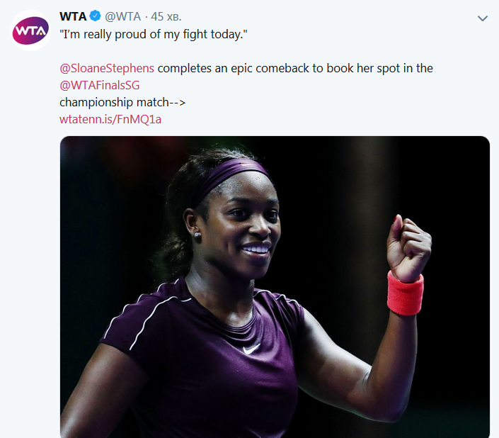 Сегодня, 27 октября, во втором полуфинале итогового турнира WTA в Сингапуре, американка Слоун Стивенс и чешская теннисистка Каролина Плишкова выясняли между собой, кто станет соперницей нашей Элины Свитолиной.