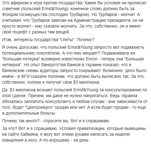 "Скорее всего, "Центрэнерго" сольют в пользу Виталия Кропачева, который уже давно управляет компанией в интересах Игоря Кононенко, бизнес-партнера Петра Порошенко, - пишет Лямец. - Деньги для этой приватизации Кропачев или его подмена заработали на этой самой "Центрэнерго". Последние несколько лет компанию перестали "пилить" представители "семьи" Виктора Януковича. Их место заняли люди Порошенко".