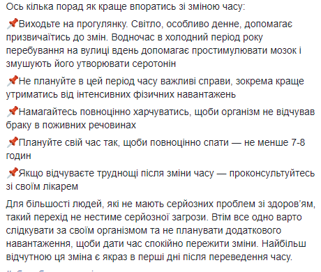 "Переход на зимнее время в конце октября ставит за цель получить больше дневного света в период, когда ночи становятся длиннее, а дни короче. В то же время солнечный свет является одним из основных факторов, что руководят циркадными ритмами человека. Поскольку устойчивость циркадных ритмов является важным для ряда биологических процессов человека, исследователи обнаружили, что это может иметь определенные негативные последствия для здоровья. К примеру, вызвать нарушения сна, сердечно-сосудистой функции и влиять на эмоциональное состояние", - считает Супрун.