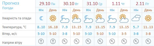 По данным сайта Sinoptik.ua, первые два дня недели будут пасмурными, в среду возможен дождь. Далее выглянет солнце. Температура +15...+16 до пятницы, а с 2 ноября +13. Ночью +6...+10.