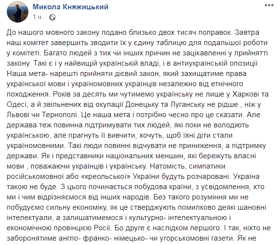 "К нашему языковому закону подано около двух тысяч поправок. Завтра наш комитет завершит сводить их в единую таблицу для дальнейшей работы в комитете", - указано на странице Княжицкого в Фейбсуке.