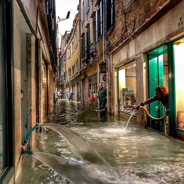 Оказавшиеся в это время в Венеции туристы активно делятся в соцсетях фото и видео с результатами потопа.