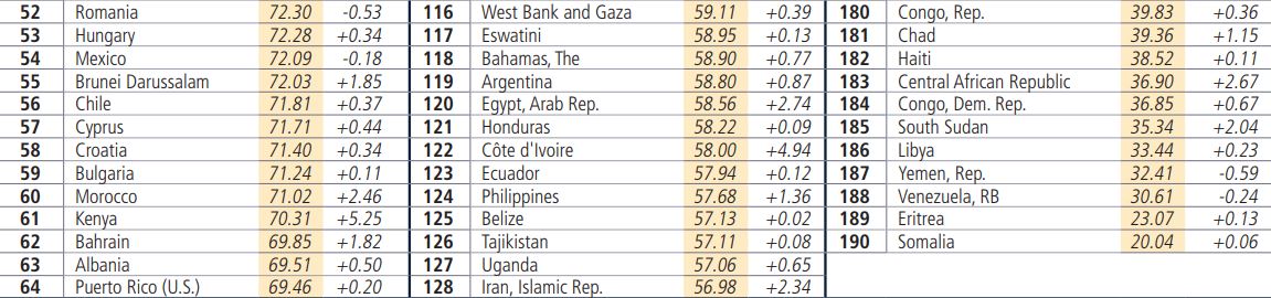 Вторую позицию занимает Сингапур. На третью строчку, опередив Гонконг и Южную Корею, вышла Дания. В пятерку стран с наихудшими показателями вошли Ливия (186 место), Йемен (187 место), Венесуэла (188), Эритрея (189 место) и Сомали (190 строка рейтинга).