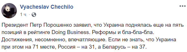 "Президент Петр Порошенко заявил, что Украина поднялась еще на пять позиций в рейтинге Doing Business. Реформы и бла-бла-бла.