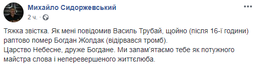 "Сегодня 16:10 умер Богдан Жолдак...", - написал он.