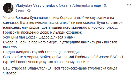 "Умер Богдан Жолдак. В свое время удалось с паном Богданом посотрудничать, наслушаться от него лестных историй и посмеяться над его баснями. Мне он запомнится именно таким: воодушевленным, жизнелюбивым и талантливым. Светлая память".