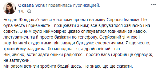 "Богдан Жолдак появился в нашем проекте на смену Сергею Иванюку. Это была честь и удовольствие - работать с ним, все происходило вовремя и на совесть. С ним было невероятно интересно общаться часами за кофе, переписываться, и просто болтать по телефону. Серьезный со мной и шутник со студентами, он всегда был очень энергетическим. Если честно, немного ему завидовала ибо младшая - я, а драйвовей - он. Он, конечно, успел сдать оценки радиопьес - просто взял и сделал это сразу же, не затягивая. Мы вместе успели сделать хоть что-то. Не знаю, что еще сказать".