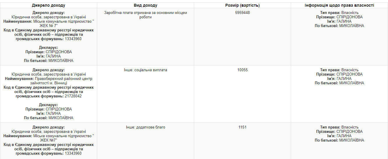 Спиридонова Галина Николаевна, которая уже несколько лет занимает должность заместителя начальника ГКП ЖЭК №7, подала свою ежегодную декларацию 21 марта 2018 года, в которой указала 5 959 448 грн зарплаты.