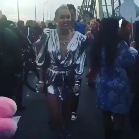 На видео видно, как певица в серебристом блестящем платье с броским макияжем движется по перекрытому мосту. На ней также высокие сапоги, волосы заплетены в косичку.