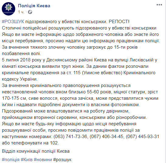 Полиция Киева объявила в розыск подозреваемого в убийстве консьержки. По данным полиции, это мужчина в возрасте около 55-60 лет, крепкого телосложения, рост 170-175 см, седые волосы, короткая стрижка, может представляться чужим именем и предоставлять поддельные документы с собственным фотоснимком. Об этом сообщает отдел коммуникации ведомства.