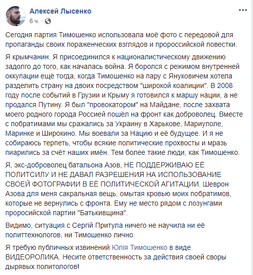 "Я, экс-доброволец батальона "Азов", не поддерживаю ее (Юлии Тимошенко - Прим.ред.) политсилу и не давал разрешения на использование своей фотографии в ее политической агитации", - написал он.