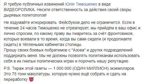 "Если в течение 24 часов Тимошенко не отреагирует, мы придем в ваш офис и лично спросим, по какому праву вы занимаетесь пиаром за счет фронтовиков, которые воевали в то время, когда вы сами сидели (и продолжаете сидеть) в тепленьких кабинетах столицы", - пишет экс-доброволец.