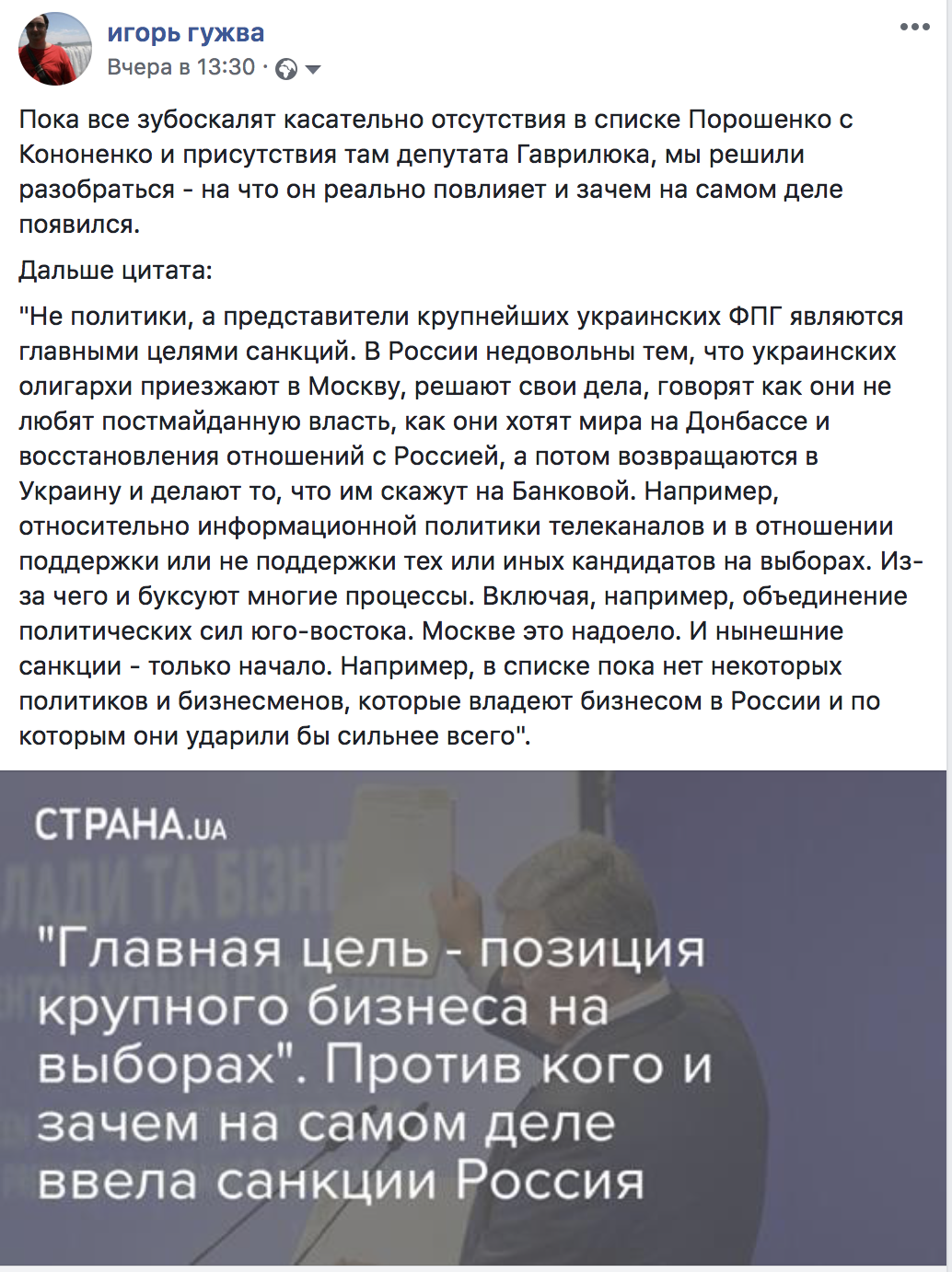 "Долго, мучительно искал в списках одесских крупных коммерсов, словом и баблом поддерживавших майдан и АТО и при этом реально сотрудничающих с Россией. Таких знаю несколько. Ни одного нет. Зато есть Гончаренко. Ну, вы поняли".