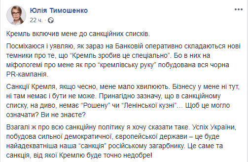 "Эта новость сделала мой день! Узнала, что попала в санкционный список России. А теперь серьезно. Меня удивляет создания Кремлем такого санкционного списка, ведь ни один адекватный человек не решится сейчас выводить капитал, или вести бизнес в такой демократически отсталой стране, как Россия. Интересно, что в санкционный список в основном лица, не имеющие активов в РФ, впрочем, в нем нет большинства тех, кто в нашем государстве проводником "русского мира".