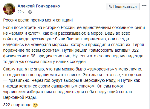 Скажу так: я не знаю, что там можно было "заморозить" у меня лично, но я доволен попаданием в этот список. Это значит, что все, что делаю - правильно. Через год будут выборы в Верховную Раду, и Путин как никогда кстати со своим санкционным списком. Он сам помог украинским избирателям определить для себя следующий состав Верховной Рады. 322 спартанца ;)"