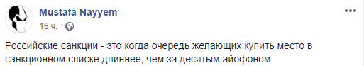 Депутат тот БПП Мустафа Найем, попавший в список, написал, что "российские санкции - это когда очередь желающих купить место в санкционном списке длиннее, чем за десятым айфоном".