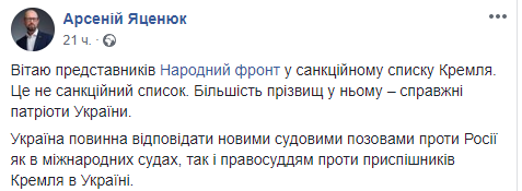 Глава Народного фронта Арсений Яценюк заявил, что члены списка - настоящие патриоты Украины. "Приветствую представителей Народного фронта в санкционном списке Кремля. Это не санкционный список. Большинство фамилий в нем - настоящие патриоты Украины. Украина должна отвечать новым судебным искам против России как в международных судах, так и правосудием против приспешников Кремля в Украине".